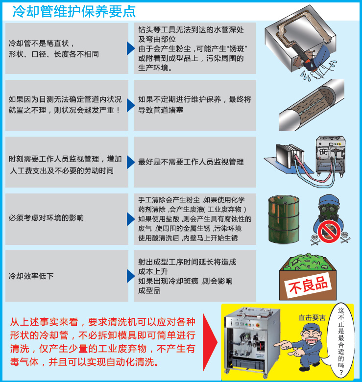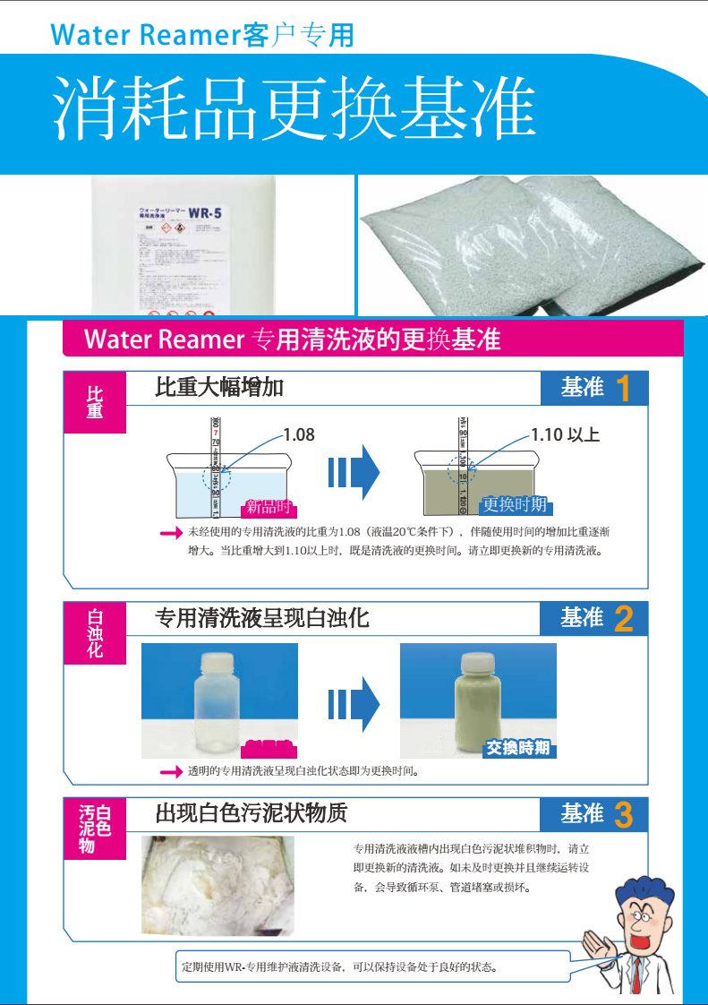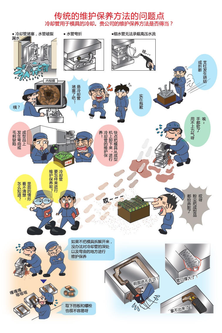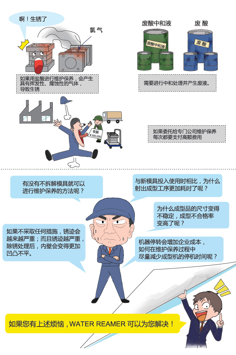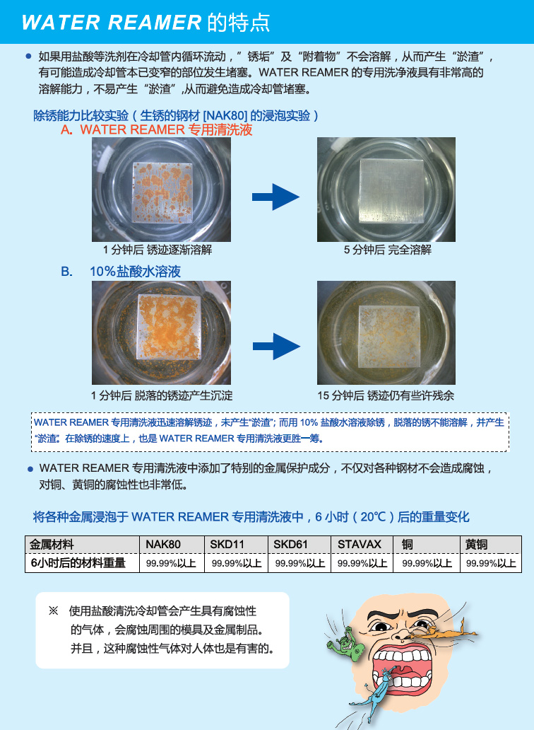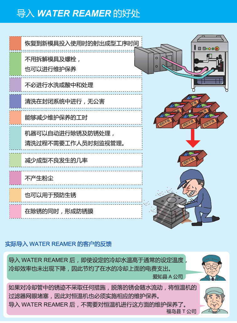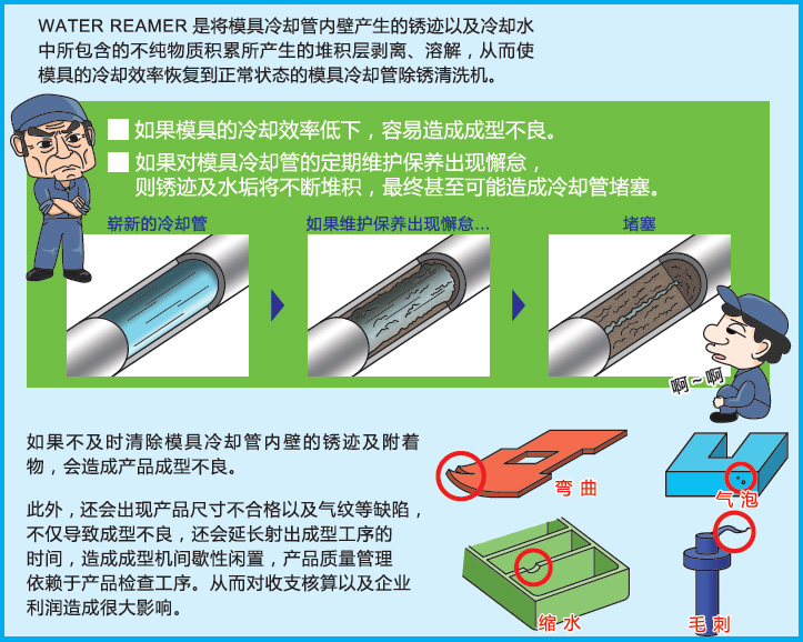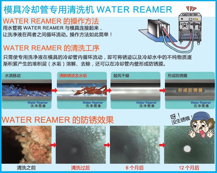 采用模具冷却管专用清洗机WATER REAMER清洗的必要性 模具冷却管专用清洗机WATER REAMER操作方法、清洗工序、防锈效果 冷却管维护保养要点 传统的维护保养方法的问题点 WATER REAMER的特点 导入WATER REAMER的好处 WaterReamer消耗品更换周期指导